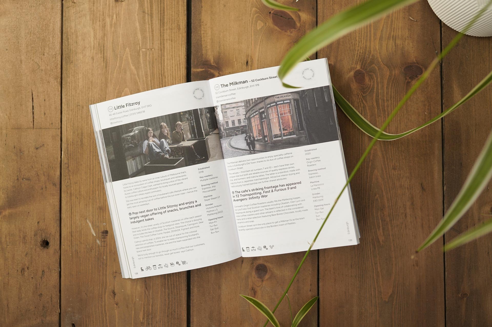 Each listing includes a detailed review plus details of the coffee machine, roaster, grinder, roaster, source of beansand signature drinks as well as info on atmosphere, whether pet-friendly and seating info, food offerings and dietary options, opening hours and location and contact details